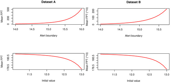 Mean FPT versus the alert boundary () and the initial value () for Dataset A, second period (left), and for Dataset B, second period (right).