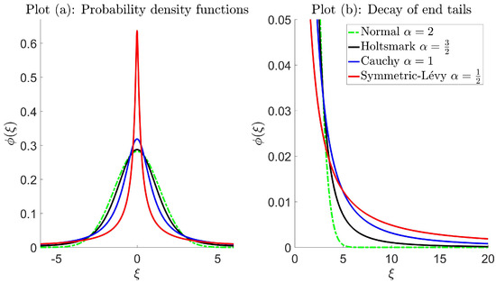 Figure 2 illustrates pdfs for symmetric stable laws with the decay of end tails characterized by different indices with faster decay rates as increases and exponential fast decay in the case of the normal distribution.