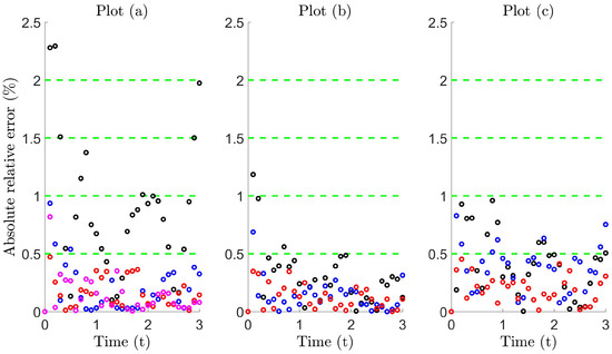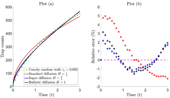 From Figure 3, Plot (b), it is clear that standard diffusion fails to predict trap counts adequately, with a maximum relative error of about 5%. This is expected since standard diffusion corresponds to the random walk model with a normal step distribution whose end tails decay exponentially, unlike the Cauchy distribution. On comparison, Table 2 shows that both super diffusion and ballistic diffusion provide a good/moderate fitting, respectively. Petrovskii et al. [26] demonstrated that in the case of some simple diffusion models, such as linear dependency on time and its variation ( constant), both of which constitute ballistic motion, provide a reasonable fit to trap count data. Figure 3 also confirms a reasonable fit for the ballistic case where the relative error lies within approximately 3%; however, still, an evident discrepancy is noticed. Trap counts are much better reproduced by super-diffusion, in this case with relative error within approximately 2%. This is somewhat expected, since it is well known that generally, super diffusion has long been acquainted with Lévy walks [43,78]. Despite this promising accuracy, note that the diffusion flux tends to alternate; in the sense that trap counts are overestimated for small time, underestimated for intermediate time and overestimated again on a larger time scale; for both the super diffusive and ballistic case. This phenomenon is also realized for other Hurst exponents in the super-diffusive and ballistic regime (simulations not shown here), even when a variety of scale parameters is considered. Although the accuracy of the matching is somewhat ecologically acceptable in either case, a diffusion coefficient that yields trap counts at a higher level of precision is sought.