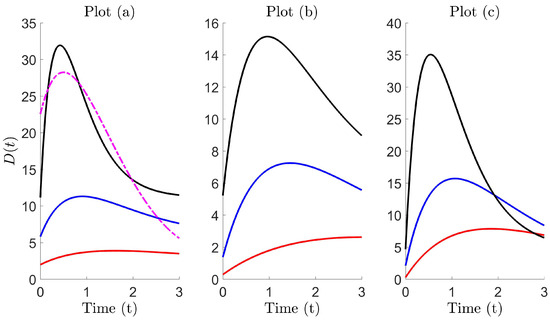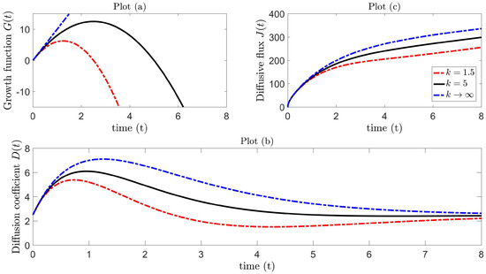 with , i.e., growth is zero at so that initial diffusivity is defined as , with obvious meaning. Here, the growth function is subject to exponential decay causing the diffusivity to be damped over larger times with damping coefficient . Subsequently, the diffusivity returns to an initial state in the large time limit as provided the growth function is not faster than exponential growth, that is . The corresponding diffusive flux for an initial uniform population density across a semi-infinite domain with zero density condition at (described in Section 3) can be derived using (20), which reads: