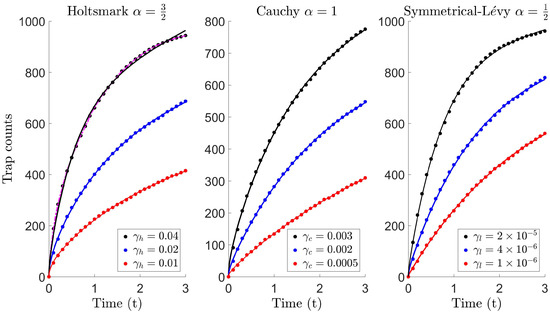 The trap count is expected to grow faster with time, compared to what is usually recorded for Brownian movement. This is due to the frequency of long jumps increasing, and therefore, the contribution from remote parts of the population to the trap count also increases. For our purposes, we simulate trap counts for the tail indices , referring to the Holtsmark (37), Cauchy (38) and symmetric-Lévy (39) distributions, previously introduced in Section 4.1. The movement dynamics are completely governed by the scale parameters . Although, comparing random walks prior to simulation runs can reveal information on parameter selection [81] (also see Section 2.2), for our purposes, it suffices to arbitrarily select three distinct scale parameters for each case, i.e., , and . Here, parameters are chosen so that trap count data are obtained with a reasonable level of variation (see Table B1). The diffusive flux curves given by Model 1 (46) and Model 2 (47) are then fitted (in the least squares sense) against these trap counts using a non-linear curve fitting tool, and the best-fit parameters are estimated, listed in Table 3.