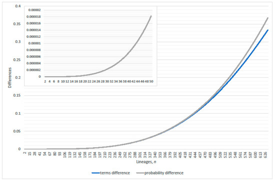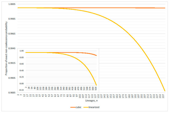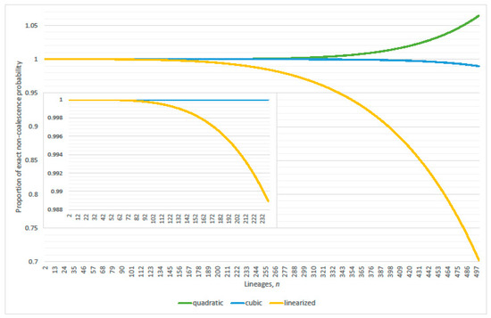 The default population size in this work is set at , unless otherwise stated, then the exponent increased and decreased by one or two to verify generality for criterion that are expressed as functions of N. Refer to Figure 1 that compares the first and third order approximation non-coalescence probabilities. The criterion [16] sets the error tolerance down to where the linearized non-coalescence probability, per generation, goes negative at ; clearly, negativity must occur at . The criterion [14] sets the error tolerance greater than 15%, and the corresponding proportion of the exact probability equals 0.825979 at . Reduction to precisely 1% error tolerance occurs at . Exact non-coalescence probability can be compared to its linearized, quadratic and cubic approximation; refer to Figure 2 and Figure 3. The difference between the quadratic and cubic terms of Equation (4) determines the error of the linearization, since non-linear terms of higher degree do not significantly affect the exact value even with many lineages present in the genealogy; refer to Figure 4. Evaluation of the non-coalescence probability suggests a criterion of 1% proportional error after round-up be .