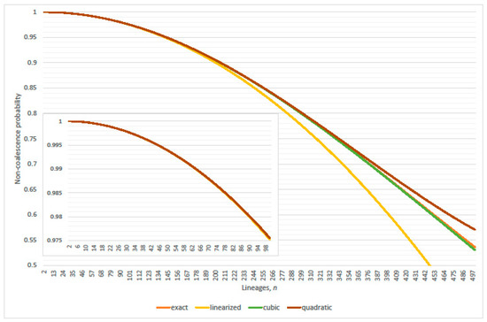 Non-coalescence probabilities: exact Equation (1), linearized , (quadratic) second order and (cubic) third order approximation of Equation (4), respectively. Population size and (inset .