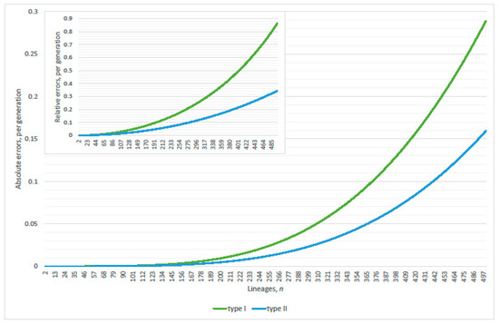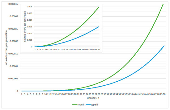 Define the absolute error (type I) as the difference between linearized and exact single pair coalescence probabilities; minus Equation (7). The quotient of the absolute error (type I) upon the exact single pair coalescence probability defines the relative error (type I). After cancellation, when n lineages remain, this equals the quotient of exact probabilities for at least one coalescence upon non-coalescence from lineages. Alternatively, define absolute error (type II) as the difference between linearized and exact at least one coalescence probabilities; minus the probability of the complimentary event to Equation (1). The quotient of the absolute error (type II) upon the exact at least one coalescence probability defines the relative error (type II). Refer to Equations (14) and (16) in Section 4 for further explanation.