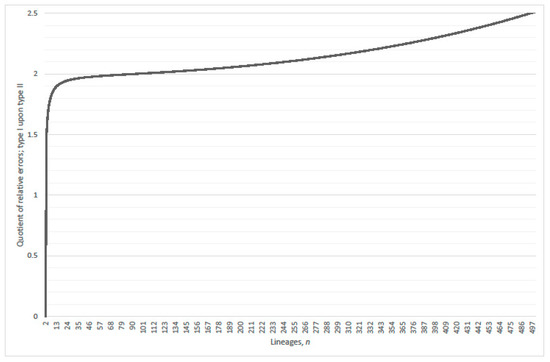 The absolute and relative errors heighten a probability structure that would be invisible otherwise; refer to Figure 6 and Figure 7. Thus, the robustness of the Kingman coalescent gets a qualitative measure. The quotient of relative errors illustrates their comparative proportional growth as n increases; refer to Figure 8. In this case, a minmax transition occurs around n = 20 between two gradient phases that correspond to the quotients of relative error type I upon type II. Intuitively, the two types of relative errors follow maximum and minimum detraction, respectively; type I corresponds to suppression of multi-coalescence altogether, whereas type II corresponds to replacement of multi-coalescence events with a single-pair, which accords to the Kingman coalescent. The single-pair and at least one coalescence probabilities for small to moderate numbers of lineages look equivalent; refer to Figure 9 in Section 2.3.