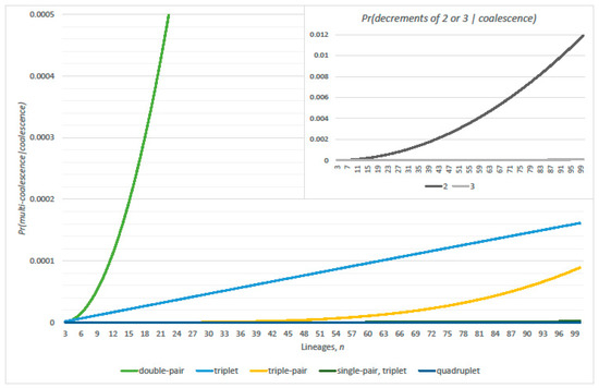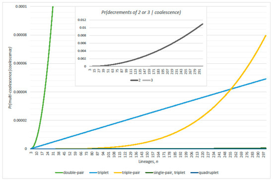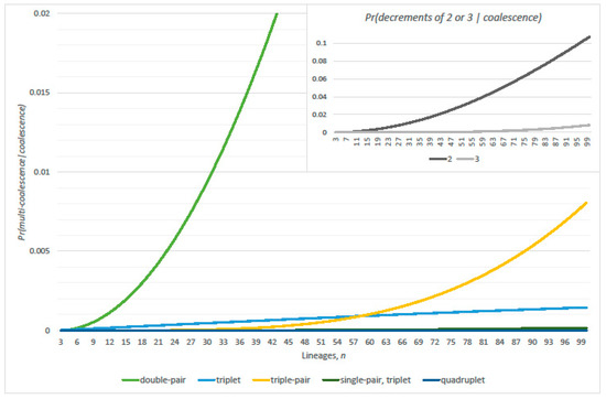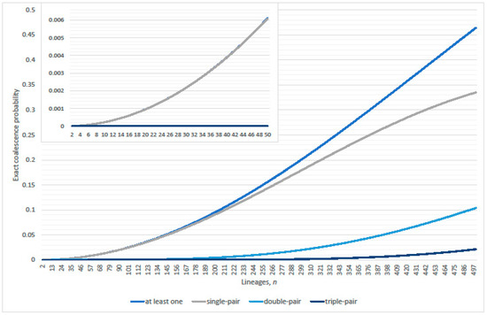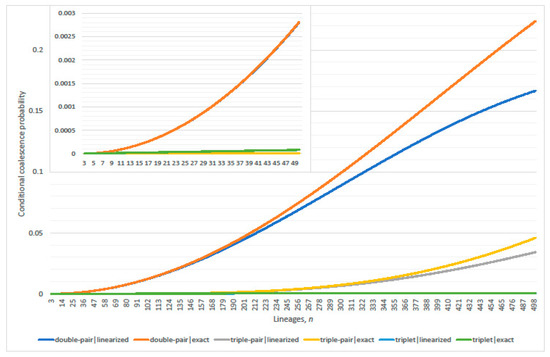 Conditional probabilities of double-pair (Equation (8)), triple-pair (Equation (10)), and triplet (Equation (9)) given either linearized coalescence or exact at least one coalescence (complimentary event of Equation (1)), respectively; and (inset ).