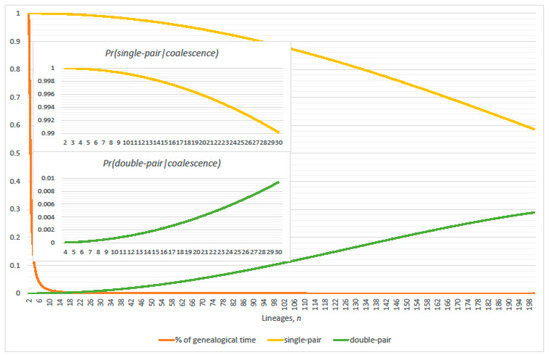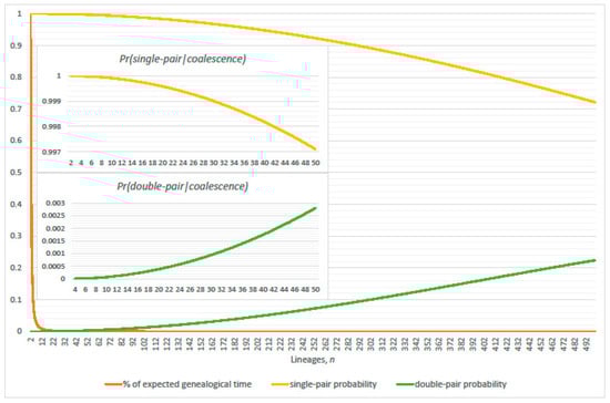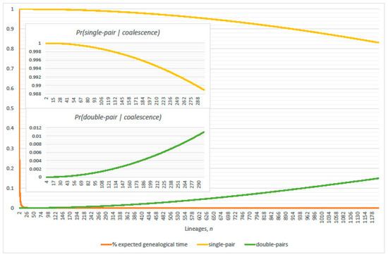Exact conditional probabilities of single-pair (Equation (7)) and double-pair (Equation (8)) coalescence given the event of at least one coalescence (compliment of Equation (1)), respectively. Percentage of expected cumulative total genealogical inter-arrival generations shows significance of expected interval durations with n lineages present. Population size and (inset ).