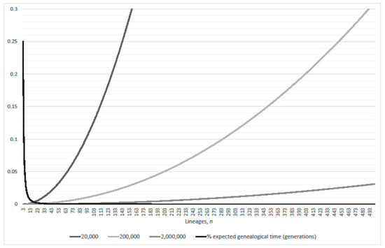 An active research field on extension of discrete generations Wright-Fisher models, overlapping generations Moran models, and generalizations to the Cannings model, are based on their multinomial offspring distribution variance and moments to develop multi-coalescents [18,19,20]. Derivations of alternative coalescent processes usually retain the conventional proportionality to ([21], Theorem 3.2 via Equation (5); [22], Theorem 2.1 via Equation (4)). These generalizations are in turn based on the partition structures of equivalence classes described in terms of sampling distributions not originally connected to genealogy [23,24,25]. The corresponding convergence-to-coalescent results tend to rely upon fast continuous time scales rather than generational ancestral processes. Thus, multi-coalescent processes replace a multinomial offspring distribution with a variety of continuous population frequency distributions that yield non-negligible jump transitions of lineage decrements greater than one in continuous-time Markov chains. There are alternative approaches to the development of multi-coalescents: (i) branching process theory ([26,27,28], for an application see [29]); and (ii) measure-valued diffusion theory [30,31]. Both approaches model proliferation of lineages over time. Further examples include β-coalescent [32], Λ-coalescent [33,34], Ξ-coalescent [35,36], and Galton–Watson theory [37,38]. Technical mathematical treatments tend to assume the foundations of ancestral processes. The quantitative analysis of Section 2 and Section 3 in this work clearly identifies regions of adherence and detraction from the Wright-Fisher ancestral process, in terms of transition probabilities and expected inter-arrival times, due to the linearization of Kingman’s coalescent that neglects multi-coalescence events.