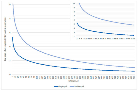 Logarithm base 10 of expected inter-arrival generations obtained from the reciprocals of single-pair (Equation (7)) and double-pair (Equation (8)) exact coalescence probabilities. Population size and (inset ). Due to a property of the Wright-Fisher model such that a geometric distribution determines the number of generations until a coalescence event occurs, the success probability of the distribution equals either Equation (7) or Equation (8).
