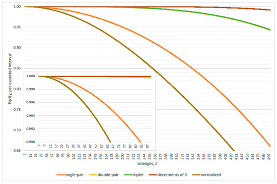 Corresponds to Figure 19 with population size enlarged ten-fold. Parity, per expected interval, restricted Wright-Fisher models: inclusively expanded set of ancestral transitions; single-pair, double-pair, triplet, decrement of three (comprises triple-pair, single-pair with triplet, and quadruplet). Normalized curve accords with Equation (17) of the Kingman coalescent. Population size and (inset ).