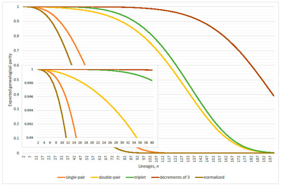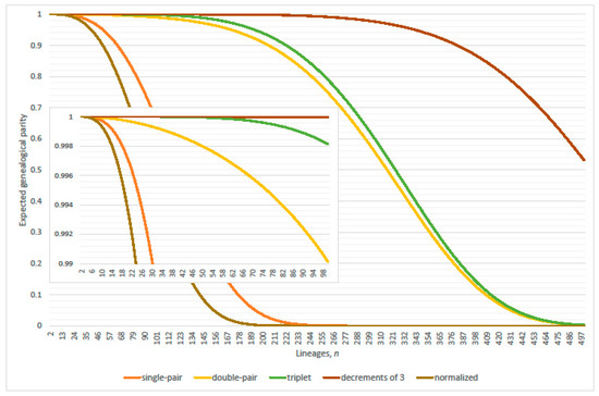 Expected genealogical parity, restricted Wright-Fisher models, inclusively expanded set of ancestral transitions; single-pair, double-pair, triplet, decrement of three (comprises triple-pair, single-pair with triplet, and quadruplet). Normalized curve accords with Equation (17) of the Kingman coalescent. Population size and (inset ).