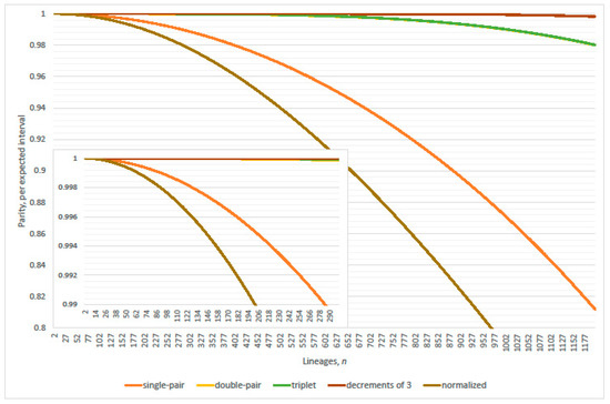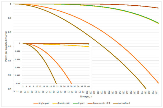 In the single-pair exact ancestral process, parity, per expected interval, exceeds precisely 99% where ; refer to Table 2. An identical criterion was observed with relative error (type II) of the linearized coalescence probability; refer to Section 2.1. In the single- or double-pair exact ancestral process, parity, per expected interval, exceeds precisely 99% where .
