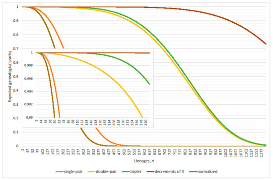 where x, y, and z denote non-coalescence, single-pair and double-pair coalescence probabilities of Equations (1), (7) and (8), respectively. The left-side of Equation (18) quantifies the long run non-occurrence probability of omitted multi-coalescence events within the expected interval duration, while n lineages remain. Double-pair coalescence yields a non-negligible probability in total, since Equation (18) contains a sum of terms on the order multiplied by Equation (8). Therefore, accumulation of double-pair coalescence probabilities over many generations sustains parity. Hence, parity of the double-pairs restricted Wright-Fisher model is significantly greater than that of the single-pairs restricted Wright-Fisher model. Additional multi-coalescence transition probabilities strengthen parity accordingly.