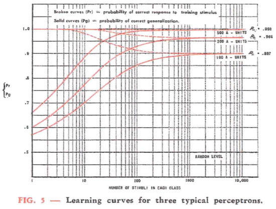 Rosenblatt presented the results of experiments in which a perceptron had to learn to discriminate between a circle and a square with 100, 200, and 500 A-units in each source set of the association system. In Figure 7, the broken curves indicate the probability that the correct response is given when identical stimuli of a test figure were shown during the training period. Rosenblatt called this “the perceptron’s capacity to recollect”. The solid curves show the probability that the appropriate response for any member of the stimulus class picked at random will be given. Rosenblatt called this “the perceptron’s capacity to generalize” [16] (p. 10). Figure 7 shows that both probabilities (capacities) converge in the end to the same limit. “Thus”, concluded Rosenblatt, “in the limit it makes no difference whether the perceptron has seen the particular stimulus before or not; it does equally well in either case” [16] (p. 4).