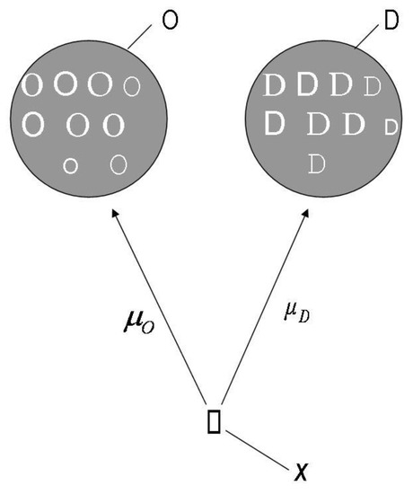 Illustration to Zadeh’s view on pattern classification: the sign □ (or x, as Zadeh wrote) belongs with membership value, μO(O), to the “class” of Os and with membership value, μD(D), to the “class” of Ds.