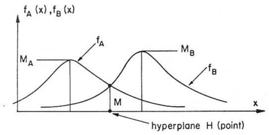 With reference to Rosen’s article, Zadeh stated and proofed an “extension of the separation theorem to convex fuzzy sets” in his seminal paper, of course, without requiring that the convex fuzzy sets A and B be disjoint, “since the condition of disjointness is much too restrictive in the case of fuzzy sets” [25] (p. 351). A hyperplane, H, in an Euclidean space, En, is defined by an equation, h(x) = 0, then, h(x) ≥ 0 is true for all points x ∈ En on one side of H, and h(x) ≤ 0 is true for all points, x ∈ En, on the other side of H. If a fuzzy set, A, is on the one side of H, and fuzzy set, B, is on its other side, their membership functions, fA(x) and fB(x), and a number, KH, dependent on H, fulfil the following inequalities: