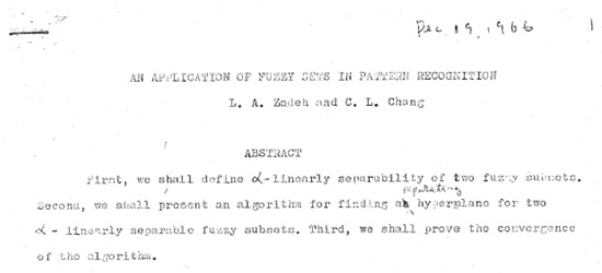 In 1962, the electrical engineer Chin-Liang Chang came from Taiwan to the US, and in 1964, to UC Berkeley to pursue his PhD under the supervision of Zadeh. In his thesis “Fuzzy Sets and Pattern Recognition” (See: http://www.eecs.berkeley.edu/Pubs/Dissertations/Faculty/zadeh.html), he extended the perception convergence theorem to fuzzy sets, he presented an algorithm for finding a separating hyperplane, and he proved its convergence in finite iterations under a certain condition. A manuscript by Zadeh and Chang entitled “An Application of Fuzzy Sets in Pattern Recognition” with a date of 19 December 1966 (see Figure 10) never appeared published in a journal, but it became part of Chang’s PhD thesis.