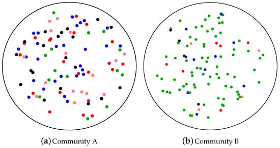 Representation of two communities of 100 individuals of different species, indicated by their colour. Richness is the absolute number of species in a community: in both communities it is equal to five. Evenness is the equitability of the species abundance distribution: in Community A all species are present in equal abundances and so it is perfectly even, while Community B is very uneven since it is dominated by the green species. The disparity is the level of similarity between species: for example, the red and the pink species are more similar in colour than the red and the black species.