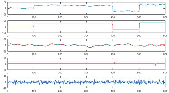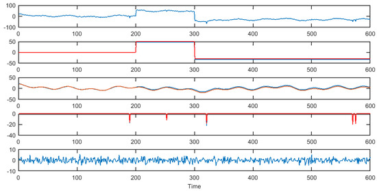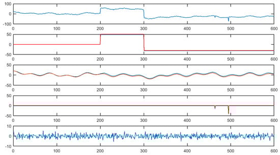 Figure 1, Figure 2 and Figure 3 demonstrate the decomposition of a signal with 2, 3, and 5 outliers, respectively. The top block of each figure is the signal itself. The second block is the extracted piecewise constant component. The red line is the true signal, and the blue one is the estimate. The third block is the extracted seasonality component, while the fourth captures information on outliers. As before, the red line is the true signal, and the blue one is the estimate. The final block is the noise component that remains after the other components have been estimated. In all three cases, there is very good agreement between the true signal and the various components extracted using the algorithm.