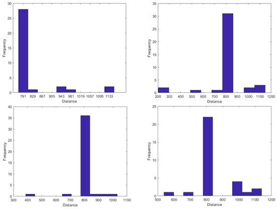 Histogram of distance measured for a minimum piecewise constant jump magnitude of (top left), (top right), (bottom left), and (bottom right).