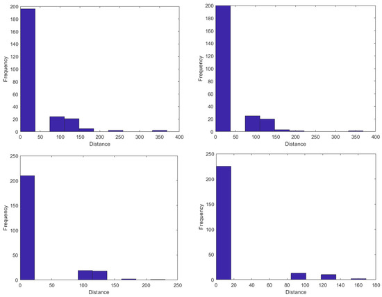 Histogram of distance measured for a minimum outlier magnitude of (top left), (top right), (bottom left), and (bottom right).