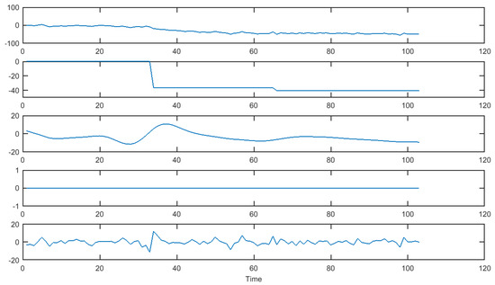 A nice survey on trend estimation is [14]. Traditional methods include model based approaches using, e.g., state space models [15] or nonparametric approaches such as the Henderson, LOESS [16], and Hodrick–Prescott filters [17]. Some comparisons can be found in [4]. More recent approaches include empirical mode decomposition [14] and wavelet decompositions [18]. A very interesting approach called -trend filtering was recently proposed by [11] among others. This method allows for retrieval of piecewise constants or, more generally, piecewise polynomial trends from signals using -penalised least squares. In particular, this type of analysis is the perfect tool for segmenting time series and detecting model changes in the dynamics. These methods have been recently approach by statistical tools in [19,20,21,22].