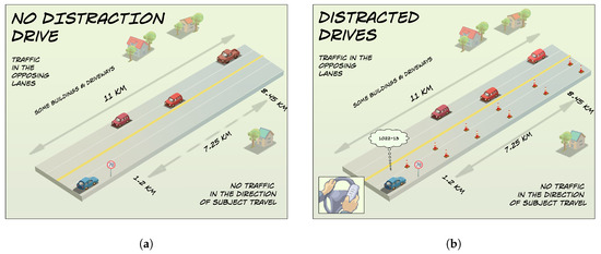 The structure of virtual simulation: (a) No distraction drive; (b) Distracted drive. In this scene, the distracted drive image shows three types of interventions and stressors that can introduce distraction: texting while driving (see picture-in-picture), solving simple arithmetic operations (see though bubble), and road hazards (see cones).