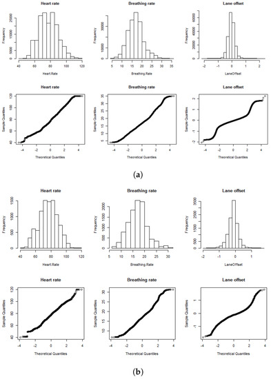 Histogram and normal probability plots of heart rate, breathing rate, and lane offset in Experiments 1 (a) and 2 (b) that demonstrate a Gaussian distribution.