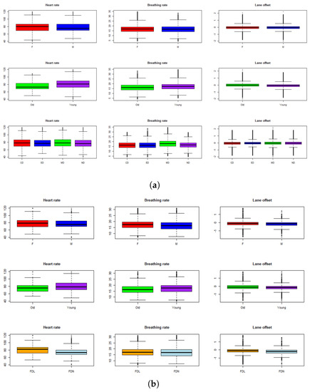 The interactions between gender, age, and interference types in predicting the lane offset, breath, and hearth rate were also found to be significant (95% confidence level) model. These interactions were even more significant (smaller probability of finding more extreme results when the joint effect was not there) in breath and heart rates compared to lane offset. In the explanatory data analysis shown in Figure 4a, MD was associated with a slightly higher median breath rate compared to ND, CD, ED, whereas the median of MD was similar to the others in regard to heart rate and lane offset. This advanced statistical model show the same effects of stress in different age groups and genders.