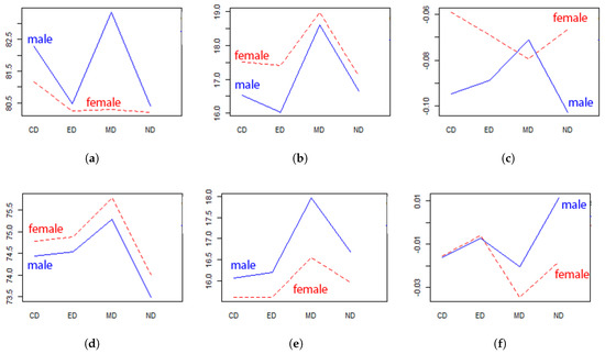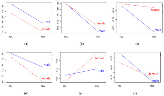 Interaction plots obtained by the mixed effects model presented in Equation (1), where the top plots are the younger drivers and the bottom plots are the older drivers. (a) Mean heart rate for young group. (b) Mean breathing rate for young group. (c) Mean lane offset for young group. (d) Mean heart rate for old group. (e) Mean breathing rate for old group. (f) Mean lane offset for old group. In these plots, the solid blue lines refer to males and the dotted red lines refer to females.