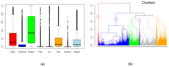 Original facial expressions and our hierarchical clustering. (a) Distribution of original facial expression signals that demonstrate that disgust is the dominated expression; (b) Compound dendogram that provides the compound correlated data of our facial expression clusters obtained by the Hiearchical Cluster Analysis (HCA) analysis [39].
