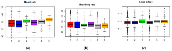 Heart rate (a), breathing rate (b), and lane offset (c) boxplots for each cluster.