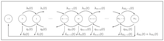 For grazing strategies TS and TM, the transient solution at time instants can be numerically derived by using splitting techniques; see [23]. In a unifying manner, we may observe that, for a host that has survived at age t with and , the possible transitions (in both strategies TS and TM) are as follows (Figure 1):