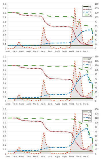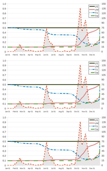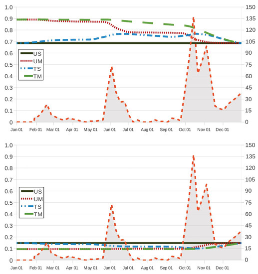 Because of seasonal conditions, a preliminary analysis of the probabilities and in the cases UM, TS and TM is usually required to determine values and in such a way that Criteria 1 and 2 lead us to non-empty subsets and of potential intervention instants , for a predetermined threshold . A graphical representation of and can help in measuring allowable values for the minimum value of effectiveness and the maximum cost of intervention in terms of concrete values for and , respectively. Figure 2 and Figure 3 show how and behave in terms of for grazing strategies UM, TS and TM. We remark here that, in scenario US, the effectiveness (respectively, cost of intervention) is given by (respectively, ), which is a constant as a function of . It is worth noting that the value (respectively, ) results in a lower bound (respectively, upper bound) to the corresponding values of effectiveness (respectively, cost of intervention) in grazing strategies UM, TS and TM.