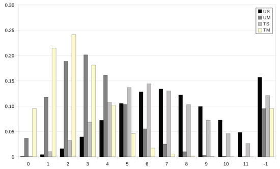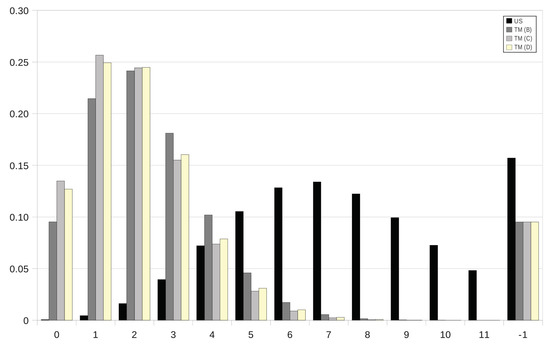 An interesting question concerns the comparative analysis between the mass functions of the parasite burden at age year in grazing strategies UM, TS and TM and the corresponding mass function in the case of no intervention. In Figure 5, we first focus on this question as intervention is prescribed at age in grazing strategies UM, TS and TM, with the anthelmintic drug ivermectin in the cases TS and TM. The movement of the host to safe pasture (strategies UM and TM) at day yields a significant decrease in the probability that the host does not survive at age year ( and in the cases UM and TM, respectively, instead of in scenario US), as well as an important decrease in the expected degree of infestation in the case of survival; more particularly, the degree of infestation is expected to be light as either anthelmintic drugs are used () or the host is transferred to a paddock with safe pasture (), instead of moderate and nearly high in the case US (). Set-stocking conditions are not as effective as the movement of the host to safe pasture since the expected degree of infestation amounts to a moderate degree in the case of survival (); moreover, for grazing strategy TS, the decrease in the probability of no-survival is apparent, but it is not as notable as for strategies UM and TM. In Figure 6, we plot the mass function of the parasite burden at age year in scenario US versus its counterpart in grazing strategy TM, when animals are treated with ivermectin, fenbendazole and albendazole at ages , 273 and 272, respectively. By Table A2 and Table A3 in Appendix A, ages , 273 and 272 are all feasible intervention instants, which leads us to mass functions that are essentially comparable in magnitude. On the contrary, the shape and magnitudes of the mass function in grazing strategy TM are dramatically different from the shape and magnitudes in scenario US, where no intervention is prescribed, irrespective of the anthelmintic product.