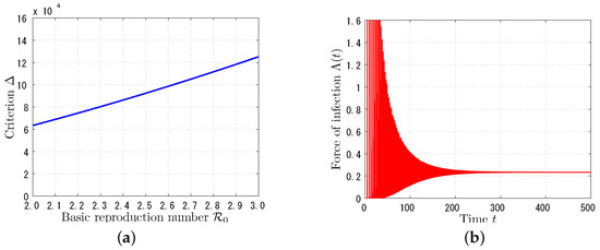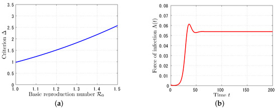 We first consider an influenza-like disease which has an infectious period of about 1 week (see [23]). Therefore, let so that the average infectious period is year week. Following the estimation result in [24], we vary the value of from 2 to 3. In Figure 1a, we can confirm that criterion defined in (17) is always positive, and hence, the endemic equilibrium is asymptotically stable. In fact, in Figure 1b, the force of infection converges to the positive equilibrium value as time evolves for .