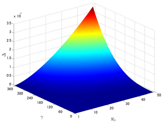 Finally, we vary the values of from to 365 (i.e., the average infectious period is varied from year = 1 day to 50 years) and from 1 to 50. In Figure 3, we can confirm that criterion is always positive in this parameter region. Hence, we can conclude that the endemic equilibrium is asymptotically stable for epidemiologically relevant values of and .