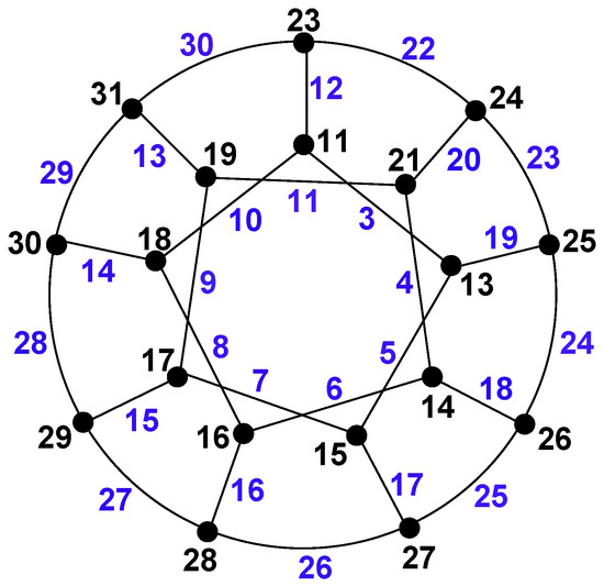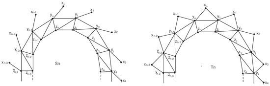 Clearly, the planar graph has vertices and edges. More preciously, we call the cycle induced by the inner cycle, cycle induced by the outer cycle, and the set vertices , the outer vertices. All subscripts are taken under modulo n. In the next theorem, we determine the total irregularity strength of the planar graph .