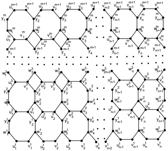 In [19,20], Diudea et al. constructed a net as a trivalent decoration made by alternating squares and octagons in two different ways. One is by alternating squares and octagons in different ways denoted by and the other is by alternating rhombus and octagons in different ways denoted by . We denote by (see Figure 1). In [21,22], they also called it the Octagonal grid.