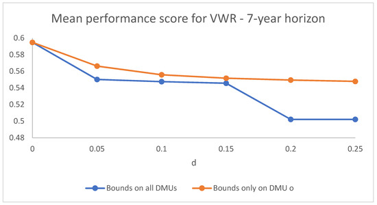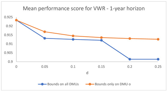 Figure 1 and Figure 2 compare the dynamics of the mean performance score in the cases of virtual weight restrictions set for all DMUs and of virtual weight restrictions with constraints on the target DMU as the bounds become more and more strict (as d increases) for and , respectively. The case represented is that of symmetric bounds, but the dynamic behaviour in the asymmetric cases is analogous. The difference in the dynamics is appreciable mainly for the higher values of d.