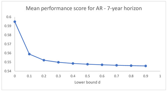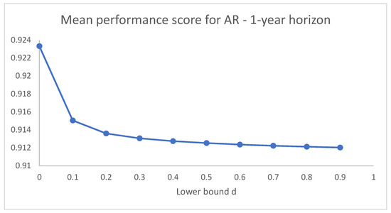 Dynamics of the mean performance scores of AR restrictions as d increases, for and symmetric bounds.