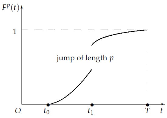 - The final instant of the game, i.e., the exact time at which all companies stop the extraction, is described by the random variable . The cumulative distribution function (c.d.f.) of is given by , which is assumed to have a break (jump) of length . The jump occurs at instant , i.e., it can be described as follows (Figure 1):where is a sufficiently regular function. By construction, there exists such that