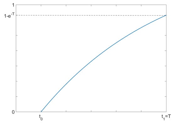 Back to the model, we suppose that the game ends at the random time instant t, a random variable having exponential distribution on the interval (Figure 2), i.e., we are investigating the first case, before the jump in the distribution. We also assume that the jump takes place in the end of the interval , i.e., . Hence, the discontinuity occurs at the terminal time. The c.d.f. of the random variable t is given by: