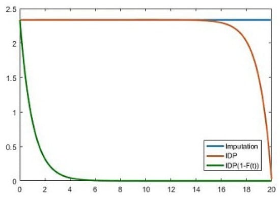 Figure 5, which was created with Matlab R2016a, portrays a sketch of the behavior of the imputation and of the IDP over time. The numerical simulation was performed for the following parameters: , , , , , and .