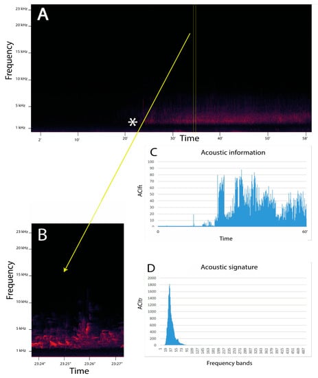 Example of an application of the ACI metrics to an acoustic file in .wav format. In this case, the file has been recorded at Madonna dei Colli (Tuscany region, Italy) (44°12′29.84″ N, 10°03′33.08″ E; 228 m a.s.l.; slope exposition: East; mixed woodland) at 04:01 9 May 2018. The start of the dawn chorus (*) is indicated in the spectrogram (A) for one hour. (B) A magnification of a few seconds from 37′24″ to 37′27″ is represented in which the acoustic signature of the song of a blackbird (Turdus merula) is visible. (C) The distribution of the acoustic information (ACIft) along one hour (in y axis ACIft values, in x axis the time in minutes) (D) The acoustic signature (ACItf) along 487 frequency bins (where each bin is 46.87 Hz) (in y axis ACItf values, in x axis frequency bins). The first 15 bins have been excluded from the representation to eliminate instrumental noise.