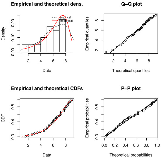 This section provides an application to show how the MBGz distribution can be applied in practice. We compared MBGz to Exponentaited Generalized Weibull–Gompertz distribution (EGWGz) by El-Bassiouny et al. [30] and other well known distributions in literature, Kumaraswamy–Gompertz (Kw-Gz), beta Gompertz (BGz) and Gompertz (Gz) models. The MLEs are computed using Quasi-Newton Code for Bound Constrained Optimization and the log-likelihood function evaluated. The goodness-of-fit measures, Anderson–Darling (A*), Cramer–von Mises (W*), Akaike Information Criterion (AIC), Bayesian Information Criterion (BIC), and log-likelihood values are computed. As usual, the lower are the values of these criteria, the better is the fit. In addition, the value for the Kolmogorov–Smirnov (KS) statistic and its p-value are reported. The required computations are carried out in the R software (version 3).