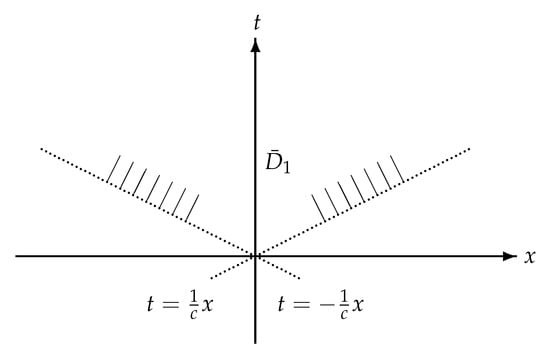 Since the propagation speed of each solution to the wave Equation (2) is c, the ‘shape’ of the wave travels at the speed of c. Roughly speaking, seems to have a similar shape at each provided . Furthermore, v strongly depends on rather than x and t separately. Therefore, the limit condition in the definition of has a natural affinity in connection with that of .