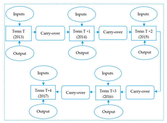 Tone and Tsutsui [30] researched and computed the theoretical aspects of the dynamic SBM model with the classification of carry-over activities that comprises of four categories including desirable, undesirable, discretionary and non-discretionary. In this study, we computed the efficiency of 18 large banks all over the world through treating desirable link. The bank company is set over terms . For each term, have inputs , outputs , and desirable output . Set , , , and indicate the observed (undesirable) input and desirable output values of at term . The symbolization of desirable link as . Let the notation as , where is the number of desirable link. The dynamic structure of enterprise is descripted in Figure 2. There are five consecutive terms, each term will deal with inputs and output variables, simultaneously the carry-over (link) will connect between two consecutive term.