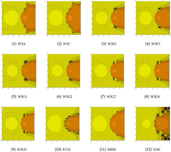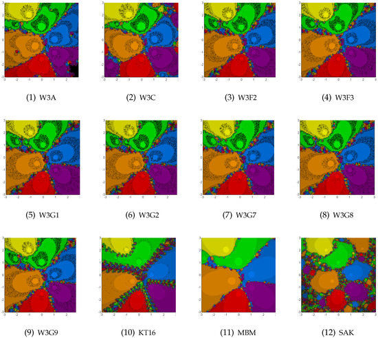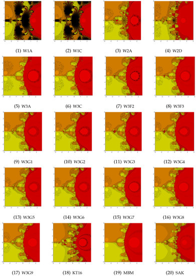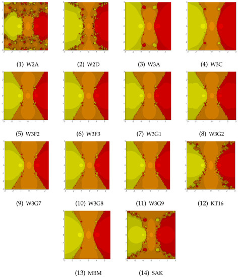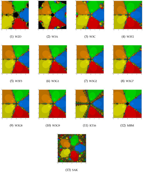 Our main aim is to devise an optimal class of sixteenth-order methods by characterizing the algebraic structure of weight functions Q f ( s ) , K f ( s , u ) , and J f ( s , u , v ) , as well as to explore their dynamics through basins of attractions [19] behind the extraneous fixed points [20] with applications to f ( z ) = ( z a ) m ( z b ) m . The right side of final substep of (5) conveniently locates extraneous fixed points from the roots of the combined weight function 1 + s Q f ( s ) + s u K f ( s , u ) + s u v J f ( s , u , v ) .