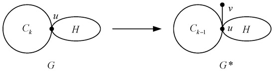 Let be a cut-edge of G, but not an pendent edge, be the connected components of , where . Constructing the graph from G by deleting and identifying the vertices , denote the so obtained vertex by u, adding an pendent edge (as shown in Figure 2).
